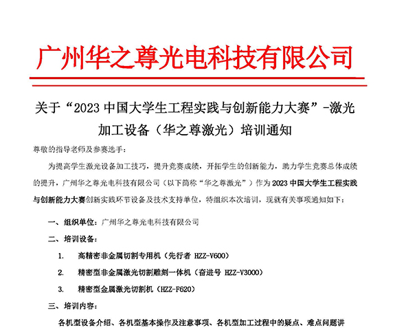 為提高學生激光設備加工技巧,提升競賽成績,開拓學生的創新能力,助力學生競賽總體成績的提升,廣州華之尊光電科技有限公司(以下簡稱“華之尊激光”)作為2023 中國大學生工程實踐與創新能力大賽創新實踐環節設備及技術支持單位,特組織本次培訓。
