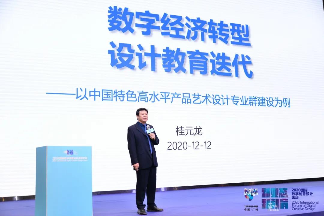 分享會上,廣東輕工職業技術學院藝術設計學院院長、教育部職業院校藝術設計類專業教學指導委員會產品設計專門委員會主任委員桂元龍以“數字經濟轉型,設計教育迭代”為主題作演講,探討數字經濟時代下職業教育新方向。